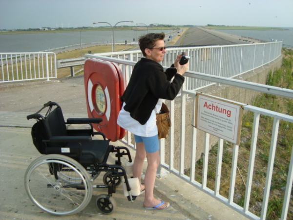 Mit Rollstuhl kommt man nur sehr schwer auf das Sperrwerk, da ist es gut wenn ein Rollstuhlfahrer 2 Helfer hat.