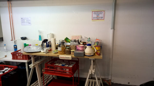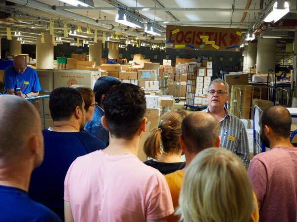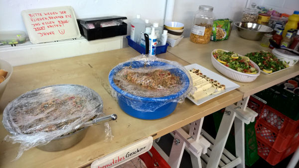Gegen 12:00 finden sich zwei Dutzend Mitbieber unterschiedlichster Nationalität in den Hallen der Großen Elbstraße 265 ein (Bus 111/112 bis Elbberg, dann die Treppen runter). Ein Projekt, das vor einem Jahr als Kleiderkammer für Geflüchtete in den Messehallen seinen Anfang nahm und zeitweise einen zweistündigen Verkehrsstau von Angabewilligen auslöste. Von den damals über tausend Helfer/innen ist ein harter Kern von weniger als hundert die regelmäßig kommen geblieben, das führt gelegentlich zu Engpässen - wenn zB Lastwagen be- oder entladen werden müssen, insofern sind Spontanhelfer/innen jederzeit willkommen. Wobei sämtliche Beteiligten ehrenamtlich tätig sind.