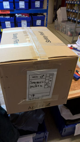 Manchmal ist auch Oberbekleidung in den Spendenkartons, dann muss man um den Tisch laufen.