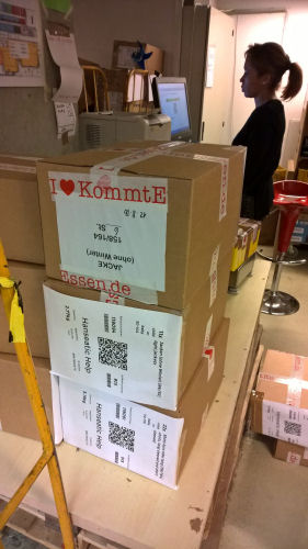 Eine Kiste, die randvoll ist, wird in einen Versandkartons geleert, dazu muss jedes Einzelstück gezählt werden. Ich verzähl mich mehrmals und muss nochmal auspacken.